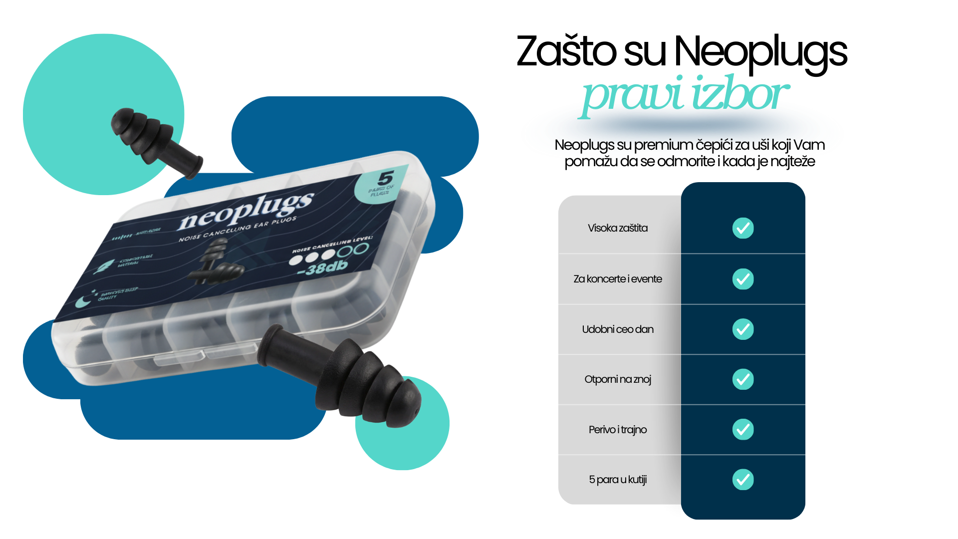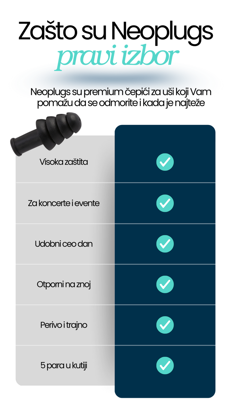 NeoPlugs čuvaju tvoj sluh, smanjuju štetnu buku, povećavaju fokus i osiguravaju mirniji san, gdje god da se nalaziš.
