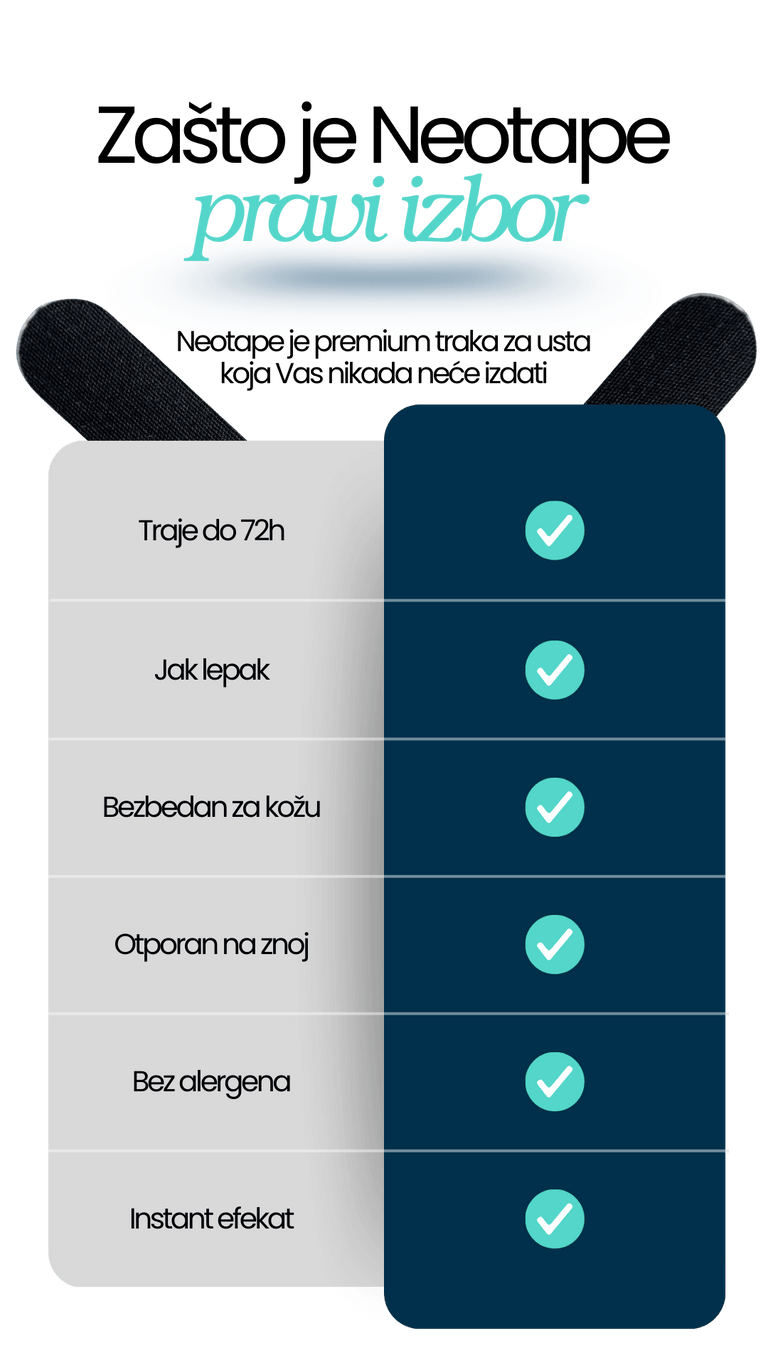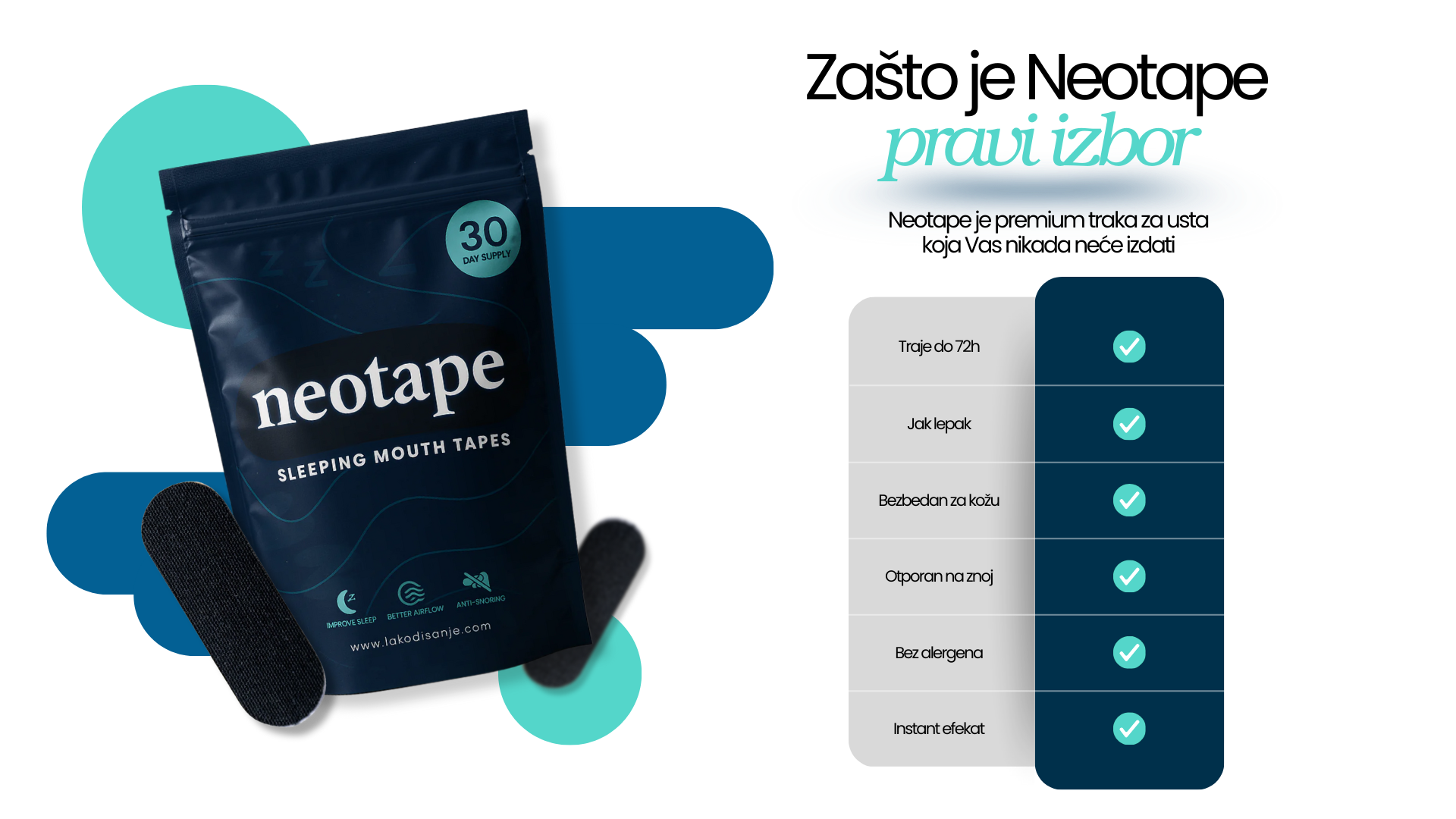 Otkrij snagu pravilnog disanja! NeoTape pomaže da spavaš bolje, smanjiš hrkanje, povećaš energiju i razviješ zdravije rutine, gdje god da se nalaziš.